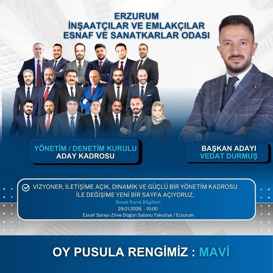 2026 Oda Seçimleri öncesinde sahaya güçlü bir başlangıç yapan Vedat Durmuş ve ekibi, sektörde değişim ve gelişim isteyen tüm oda üyelerinden destek beklediklerini ifade ederken, Erzurum için umut veren bir yönetim anlayışının kapılarını aralıyor.
