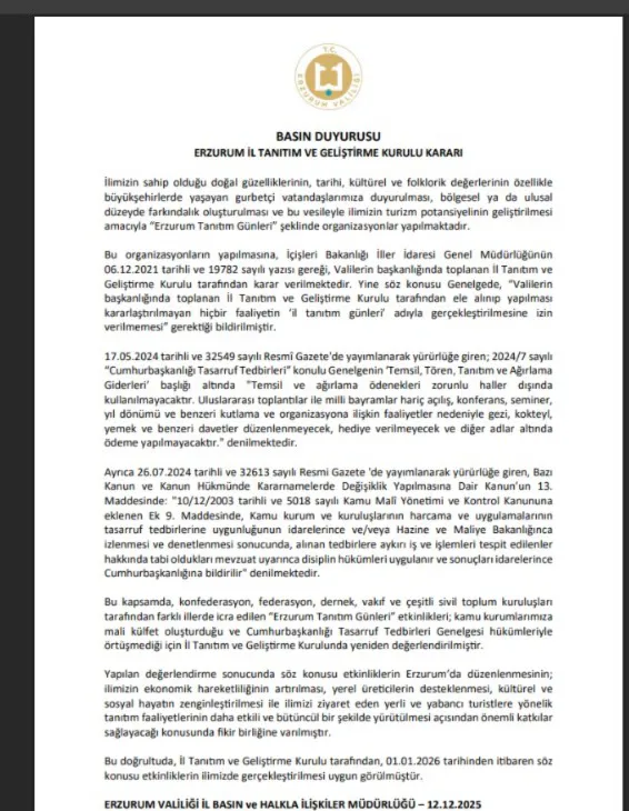 Erzurum İl Tanıtım ve Geliştirme Kurulu’nun aldığı karar doğrultusunda, 2026 yılından itibaren “Erzurum Tanıtım Günleri” etkinliklerinin yalnızca Erzurum’da düzenleneceği açıklanmıştır. Bu karar, şehrin ekonomik hareketliliğini artırmak, yerel üreticileri desteklemek ve kültürel hayatı zenginleştirmek amacıyla alınmış olsa da kamuoyu açısından bazı önemli çekinceler doğurmaktadır.