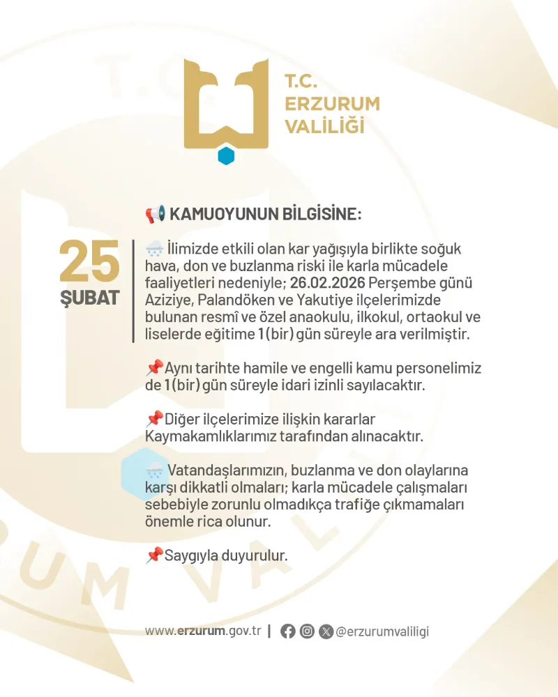 Erzurum Valiliği tarafından yapılan açıklamaya göre, il genelinde etkisini sürdüren yoğun kar yağışı, soğuk hava, don ve buzlanma riski ile karla mücadele çalışmaları nedeniyle 26 Şubat 2026 Perşembe günü bazı ilçelerde eğitime ara verildi.