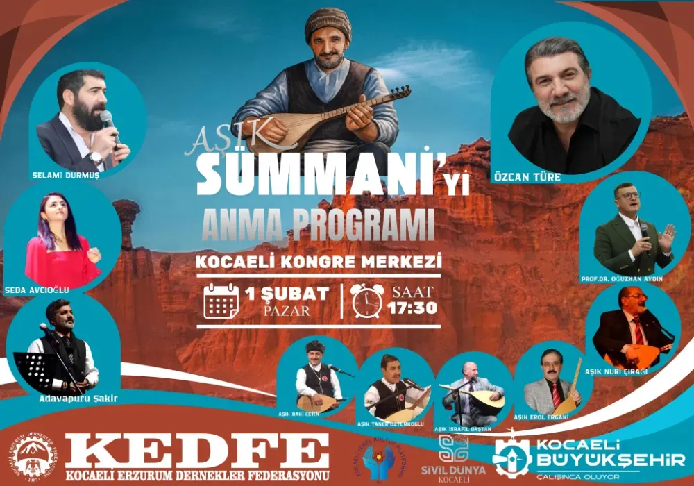 Kocaeli Erzurum Dernekler Federasyonu, Erzurum’un kültür hazinesinde müstesna bir yere sahip olan, âşıklık geleneğinin öncü isimlerinden Âşık Sümmani’yi anmak amacıyla anlamlı bir kültür gecesine imza atıyor. Federasyon Genel Başkanı Tekin Dursun’un öncülüğünde düzenlenen bu özel program, “Palandöken’den Kartepe’ye Gönül’den Gönüle Uzanan Bir Kültür” temasıyla 1 Şubat Pazar günü Kocaeli Kongre Merkezi’nde kültür sevdalılarını bir araya getirecek.
